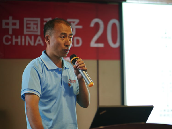 公司總經(jīng)理陳兆波在會(huì)場(chǎng)介紹雜交小麥在京津冀產(chǎn)業(yè)化推廣情況和環(huán)渤海濱海鹽堿地的大面積示范情況。